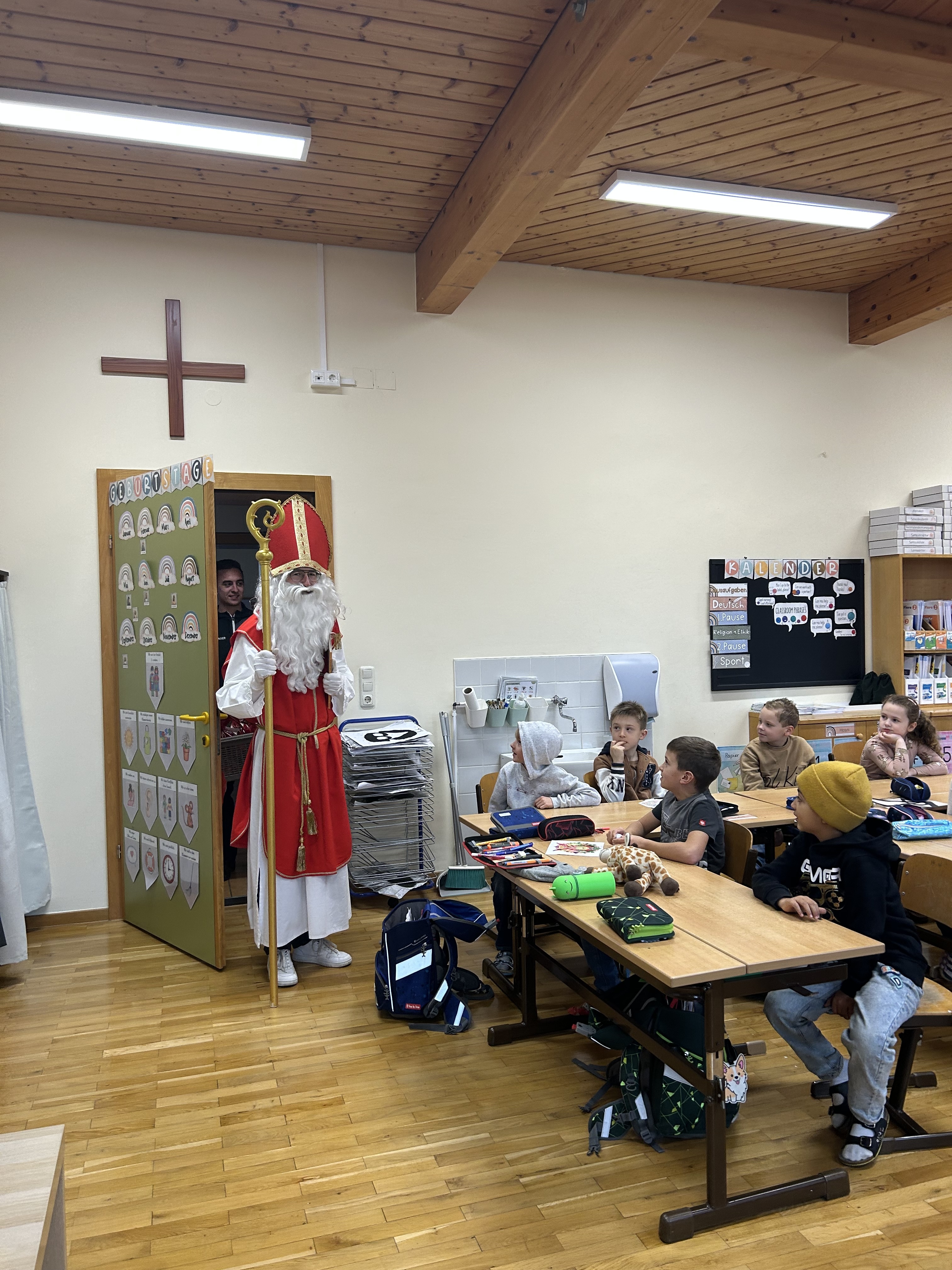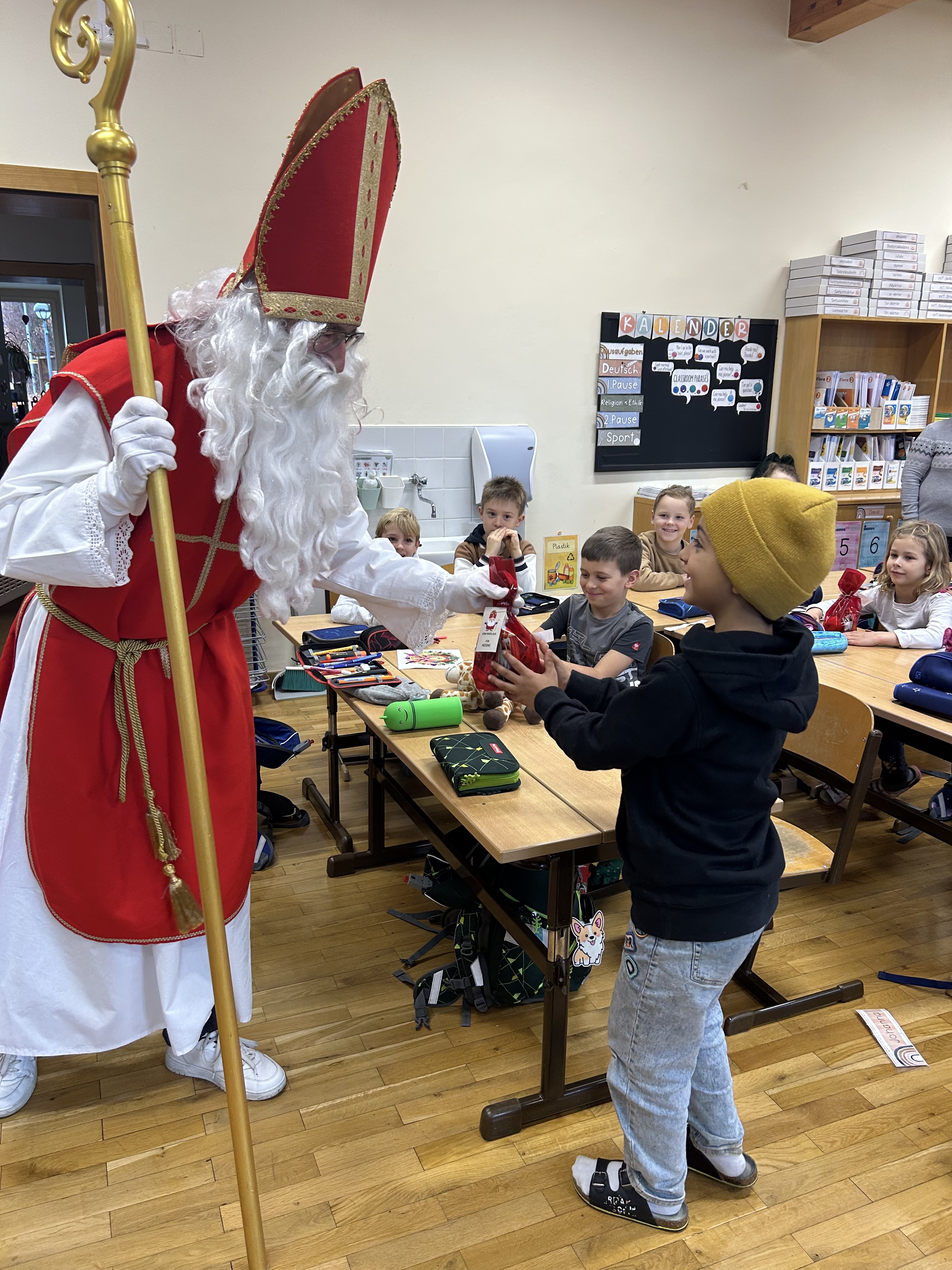 Am Freitag dem 5. Dezember war ein ganz besonderer Tag für unsere Schülerinnen und Schüler: Der Nikolaus hat uns besucht! Mit seinem großen Buch, seinem warmen Lächeln und einem Sack voller kleiner Überraschungen kam er zu uns und brachte Kinderaugen zum Strahlen.