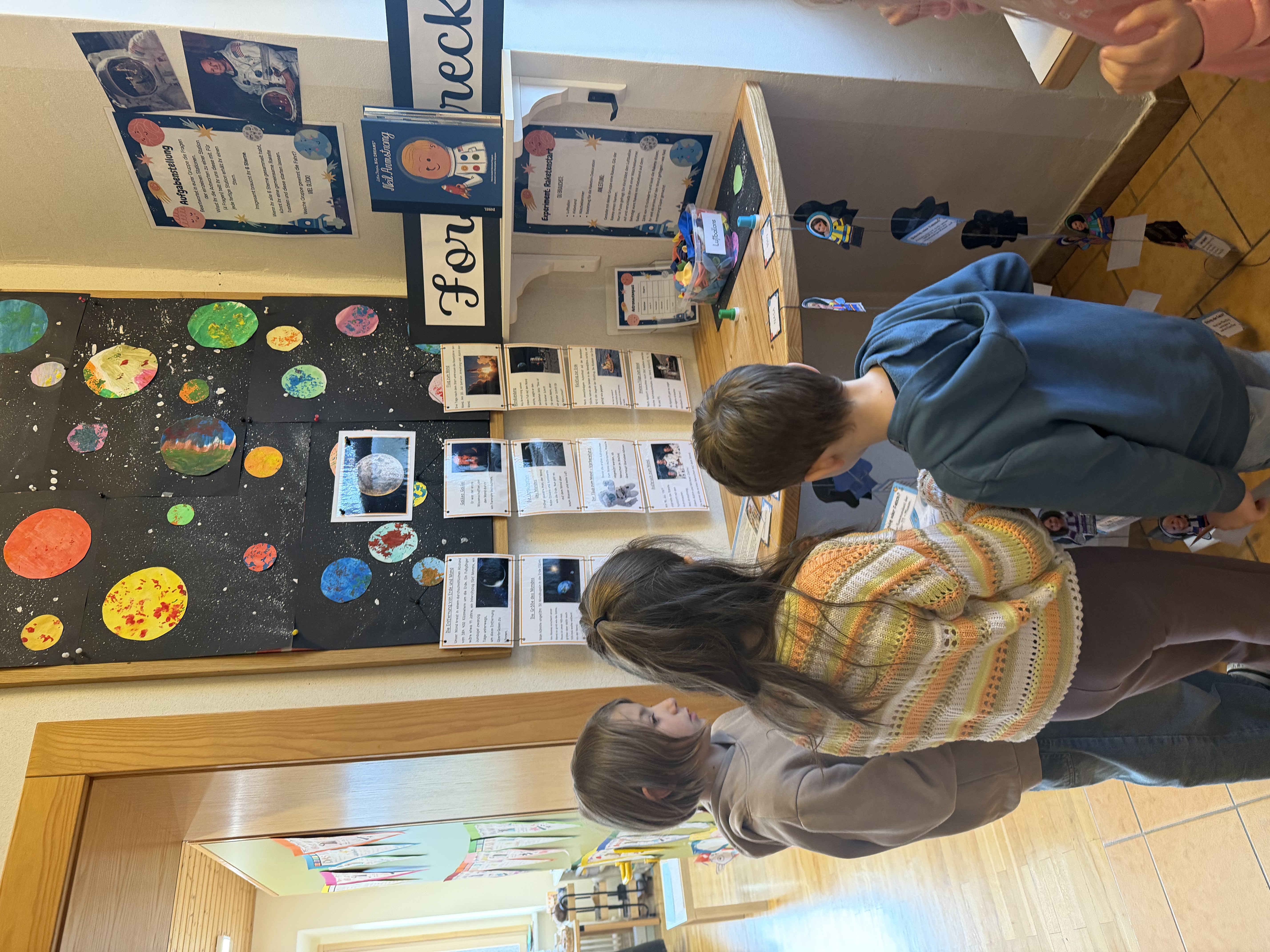 Derzeit dreht sich alles um den Weltraumpionier Neil Armstrong. Alle Schulstufen arbeiten an verschiedenen Stationen, beantworten Fragen und sammeln gemeinsam Sterne. Ziel ist es, am Ende einen „Raketenstart“ quer durch das Schulgebäude zu ermöglichen. Zum Vorlesetag wurde ergänzend das Kinderbuch von Neil Armstrong vorgelesen und wichtige Fakten zum Astronauten geklärt. Es bleibt spannend, welche Gruppe ihre Rakete als Erste starten kann und alle Rätsel erfolgreich löst.